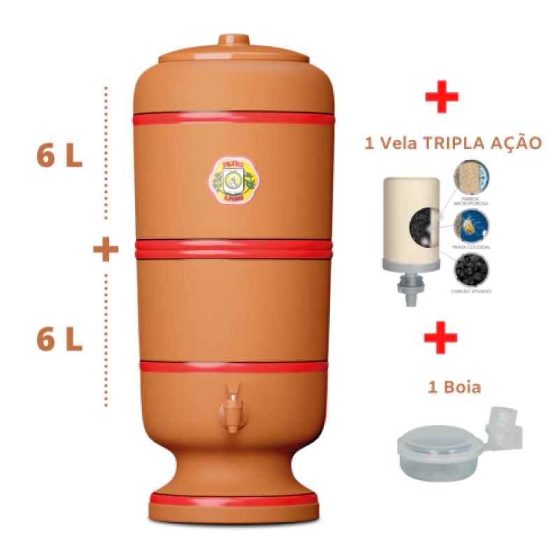 Filtro de barro com capacidade de armazenar 12 litros de água no total sendo 6 litros na parte superior e 6 litros na parte inferior;