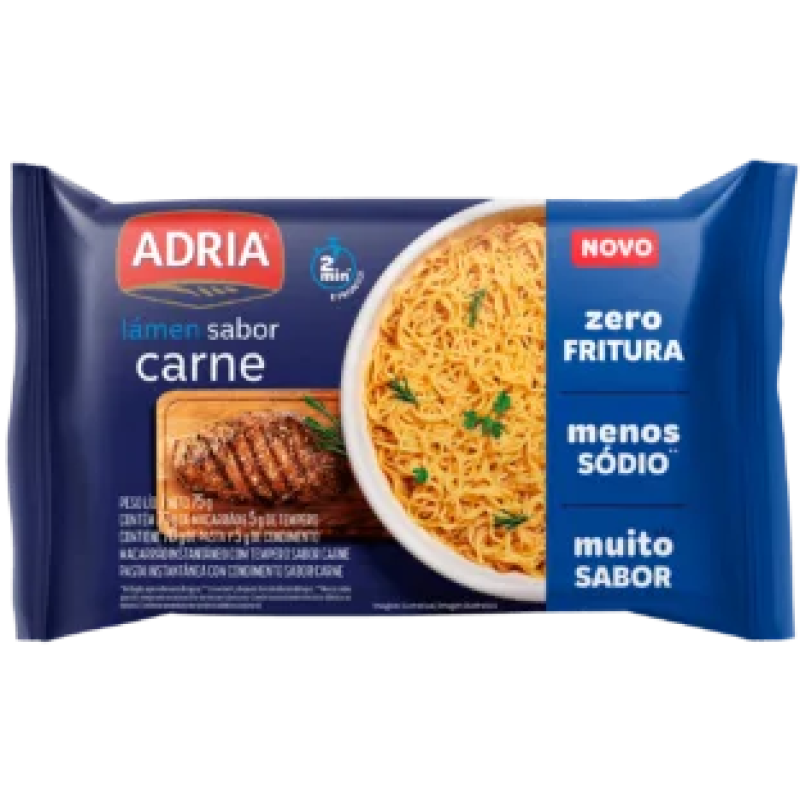 O Lámen Sabor Carne Adria é um macarrão instantâneo da marca Adria, que oferece um prato rápido e prático, com um tempero sabor carne "Zero Fritura", que utiliza tecnologia de ar quente para um produto mais leve, mas ainda assim saboroso.